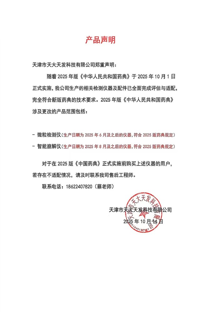 聲 明鑒于2025版《中國藥典》的更新,為保障天大天發忠實用戶的切身利益,凡在2025年之前購置我公司設備的客戶,若您的設備未能滿足新版藥典的要求,我們將提供升級服務。涉及產品:微粒檢測儀:GWJ-1···...